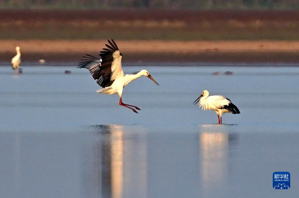 11月11日,东方白鹳等候鸟在江西鄱阳湖南矶湿地国家级自然保护区的湿地栖息。新华社记者万象/摄