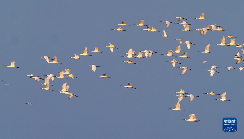 11月11日,一群白琵鹭在江西鄱阳湖南矶湿地国家级自然保护区的湿地上空飞翔。新华社记者万象/摄