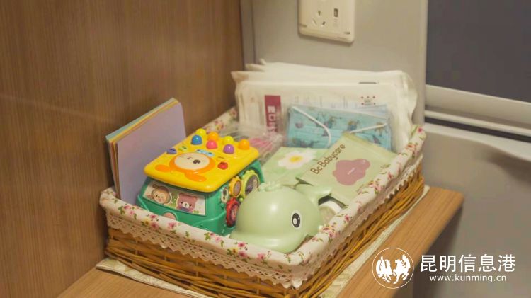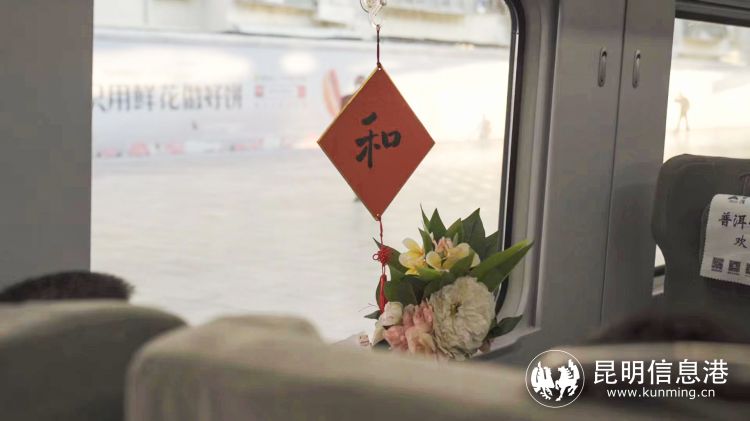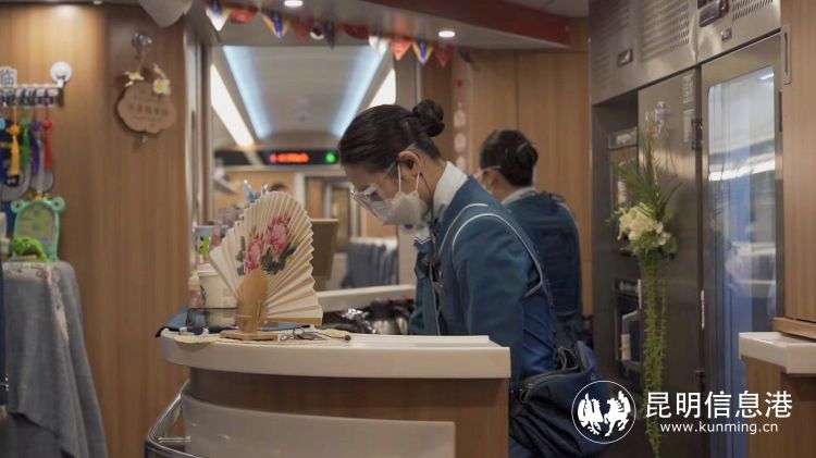 昆明局集团以打造中老铁路高品质列车服务为目标,积极为旅客提供安全、舒适的安馨旅途。比如,在列车摆台装饰上下足功夫,餐吧和一等座以“祥和”为主题进行布置,以中老两国国花牡丹花和占芭花相互点缀融合,寓意:吉祥如意、和平共处、中老友谊、万古长青。途中以旅客需求出发,创新服务举措,在餐吧车设立“安馨服务站”,为旅客提供U型枕、三合一数据线、针线盒、老花镜、防潮垫、儿童(成人)口罩等温馨服务备品,给乘车旅客带来更安全、更温馨、更便捷的乘车体验。6号车厢乘务室设立“妈咪小屋”,为旅客提供母婴哺乳帘、独立包装不同型号的尿不湿、婴儿湿巾、棉柔巾、免洗消毒凝胶、玩具等贴心服务备品。