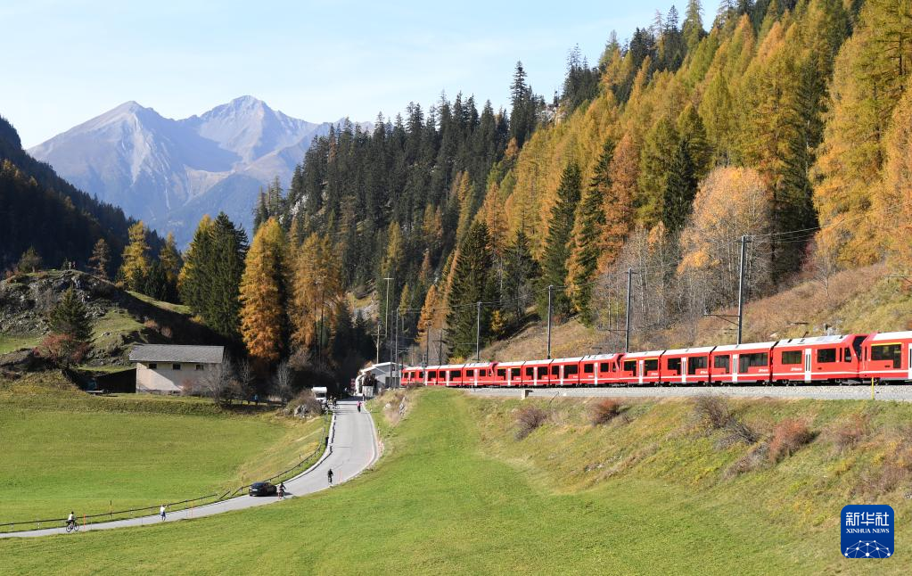 10月29日,世界最长窄轨客运列车在位于瑞士阿尔卑斯山区的雷蒂亚铁路网上行驶。新华社记者连漪/摄