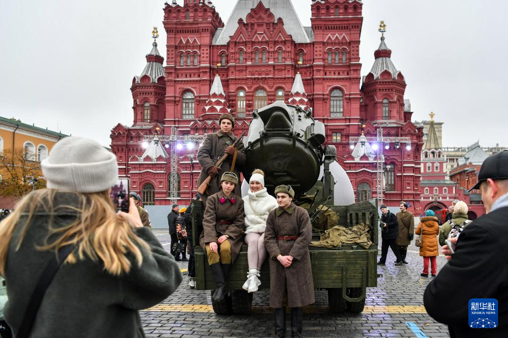 11月7日,在俄罗斯首都莫斯科,人们在以纪念1941年苏联红场阅兵式为主题的露天展览上拍照。新华社记者曹阳/摄