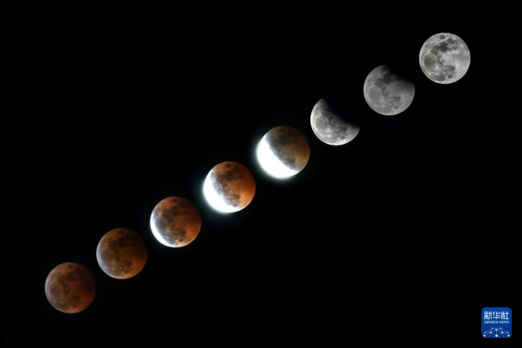 这是11月8日晚在菲律宾奎松城拍摄的月食景象(合成照片)。新华社发(乌马利/摄)