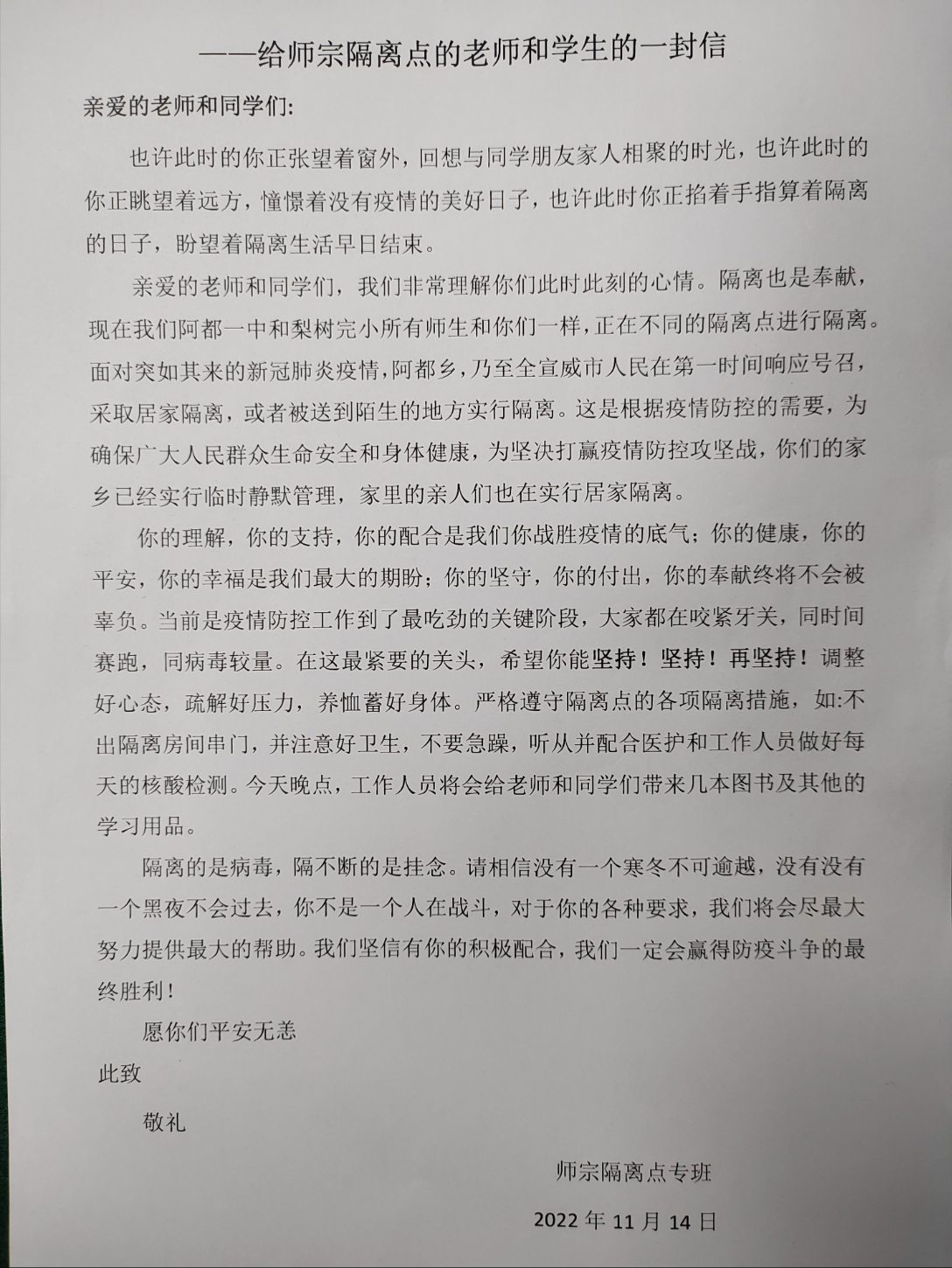 写一封“温情”的信。隔人不隔心,守护一直在。11月15日,143封由“兄弟”市(县)派驻陪护工作人员及红砖厂集中隔离点专班工作人员手写的书信,送到了每位隔离学生的手中。“心中有爱,春暖花开。”“我们心手相牵,没有跨不过去的坎,加油!”用文字彰显温度,用语言表达力量,在保证食宿条件,满足生活必要需求前提下,隔离组采取写信等暖心举措,不断加强对学生集中隔离期间的关心关爱和人文关怀。