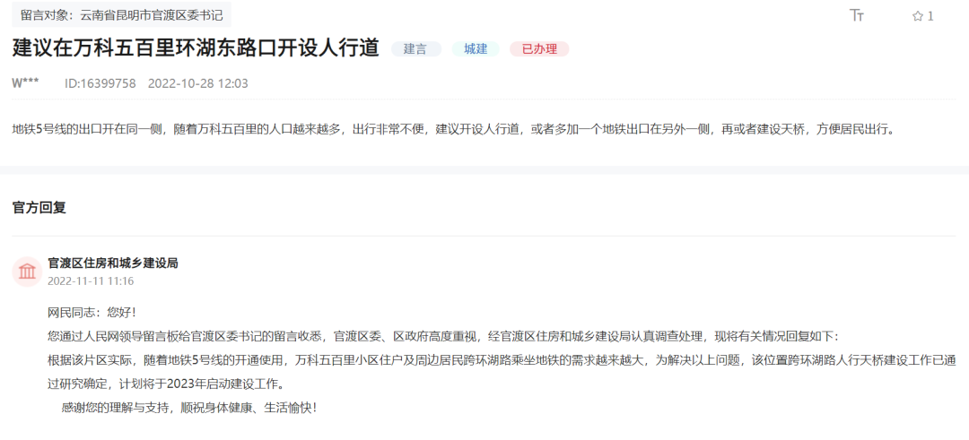 官渡区住房和城乡建设局于2022年11月11日回复,其中提到:根据该片区实际,随着地铁5号线的开通使用,万科五百里小区住户及周边居民跨环湖路乘坐地铁的需求越来越大,为解决以上问题,该位置跨环湖路人行天桥建设工作已通过研究确定,计划将于2023年启动建设工作。