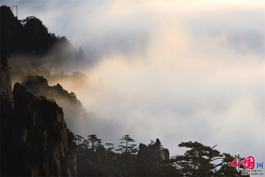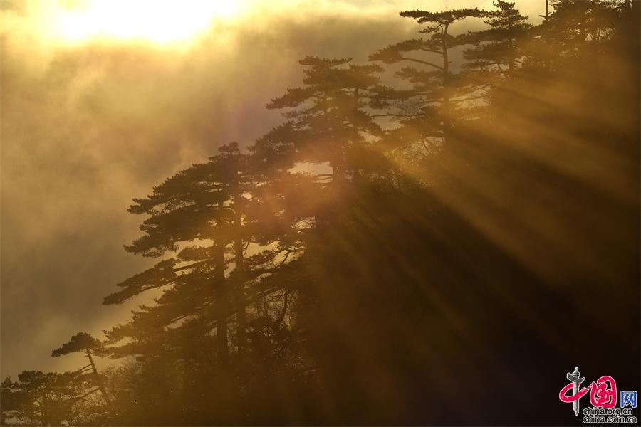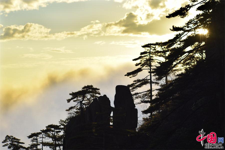 11月15日早上,受冷空气影响,黄山雨后放晴,云海、霞光、佛光齐现。