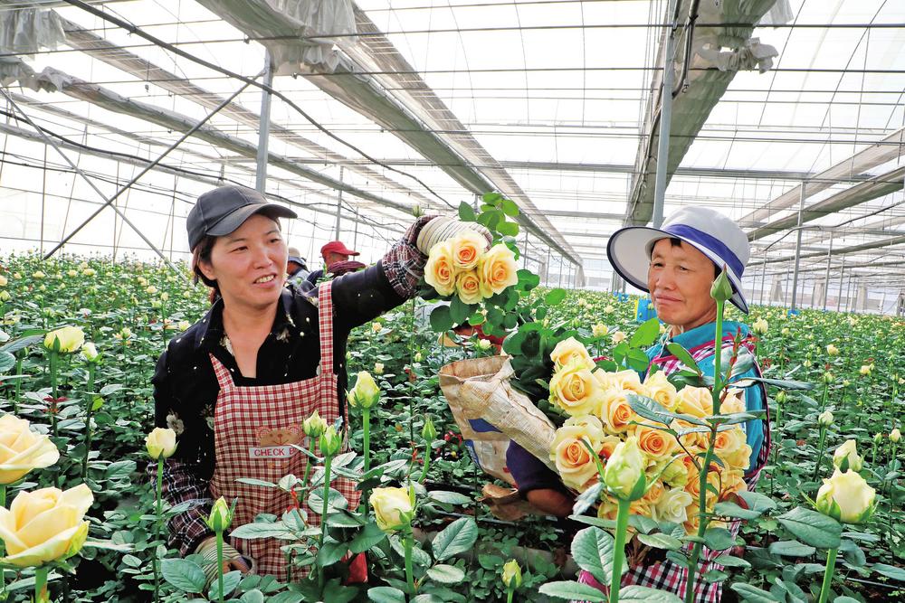 曲靖市罗平县九龙街道关塘玫瑰种植基地,一座座大棚伫立在田间。集中采摘时节,每天都有村民在花海中穿行采摘,一派忙碌的采收景象。 通讯员 李忠桥 侯映 摄