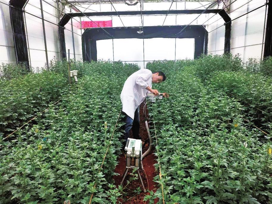 开远国家现代农业产业园里,南京农业大学菊花研究团队正在做科研。孙江荭 摄