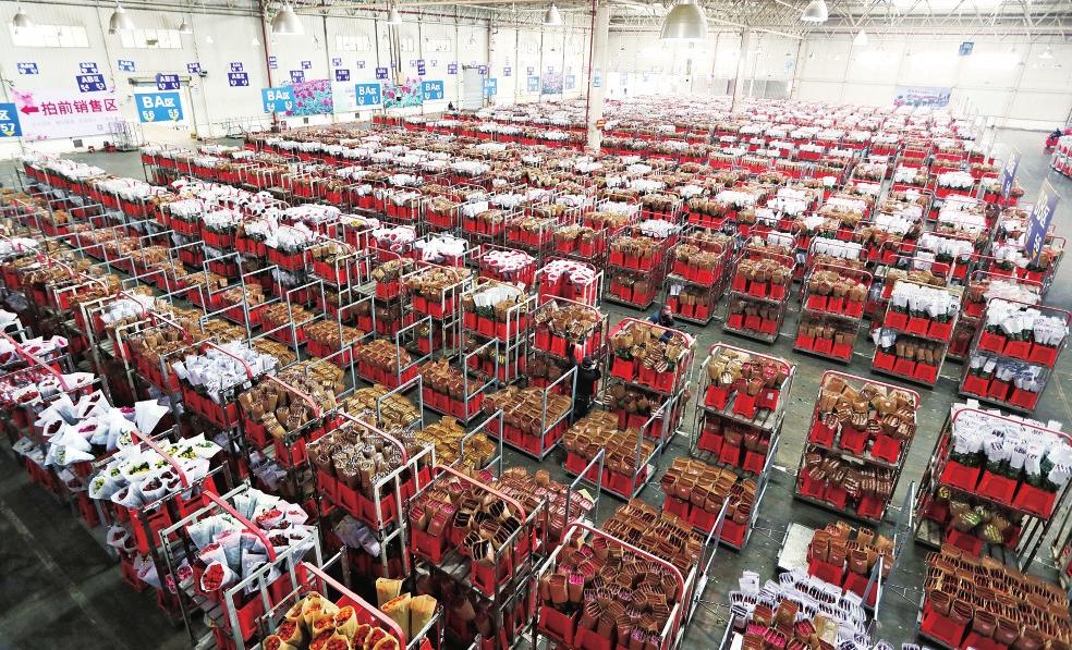 昆明国际花卉拍卖交易中心待拍区货场,排满了准备进场交易的玫瑰鲜花。 本报记者 杨峥 摄