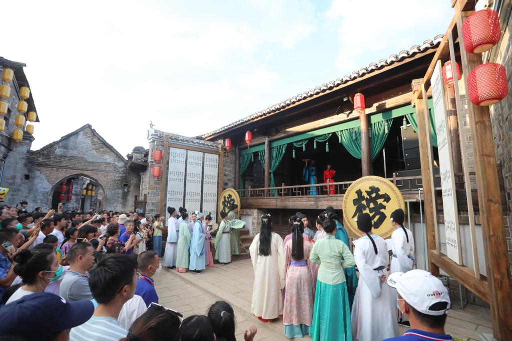 长街深巷依旧在,身着古代服饰的演员们舞姿婀娜,大型沉浸式实景演出《流芳》每天都在上演。演出结合跑酷、悬浮装置、水雾造景等,不仅还原村史馆、地方志等记载的真实历史故事,还将霉鱼、霉豆腐等传统小吃的叫卖场景融入其中。