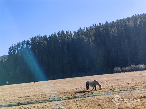 一行人乘坐观光车前往14公里外的属都湖大众观光体验区进行“打卡”,道路右侧是一条贯穿山箐的属都岗河,河水在翠绿的山脚下蜿蜒向南流去,经小中甸、至虎跳峡,流入金沙江。景区内,一个名为洛茸村的村庄悠悠而出,村落被原始森林环抱,被耀眼的阳光普照,村民生产生活悠然自得。