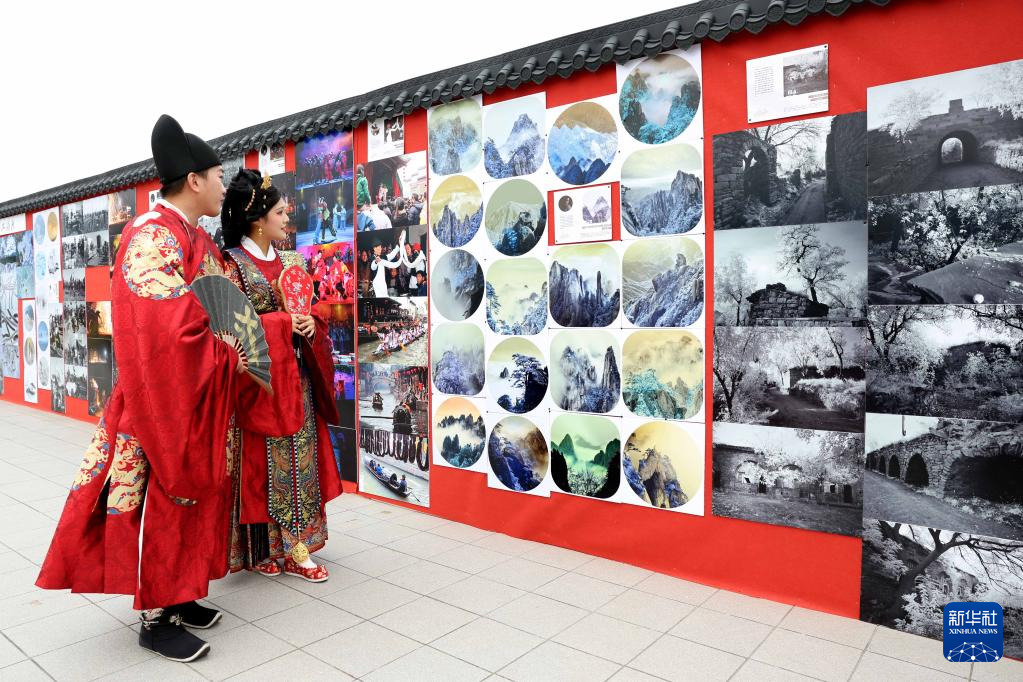 11月11日,两位身着汉服的舞蹈演员在淮海摄影文化周主题展上观看展出的摄影作品。