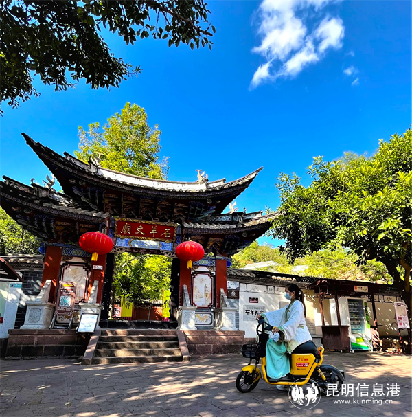 “强国电单车”投放大姚县石羊镇后,当地居民骑车打卡石羊文庙。