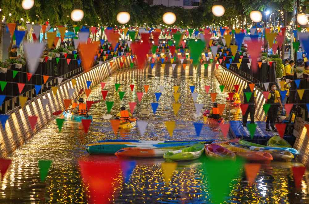 ↑2021年10月15日,游客在泰国曼谷翁昂运河步行街参加划船活动。