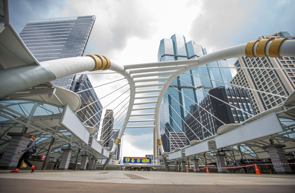 ↑2021年8月20日,在泰国曼谷,一名行人从天桥走过。