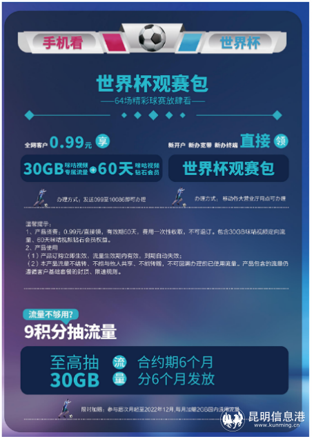 云南移动还推出了“9积分抽流量”的福利活动,至多可抽30GB流量,球迷们就可以在咪咕视频上放心观看世界杯。