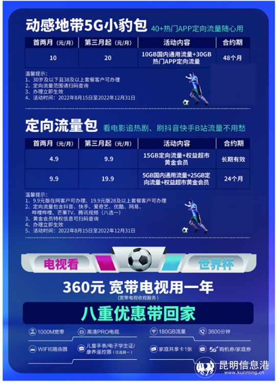 针对在世界杯举办期间到云南移动办理宽带电视收视业务的用户,除了能够享受到云南移动的“心级”服务外,还可享WiFi6路由器、高清PRO电视、180GB流量等八重优惠。