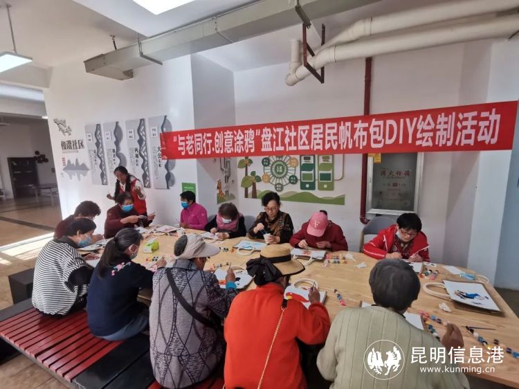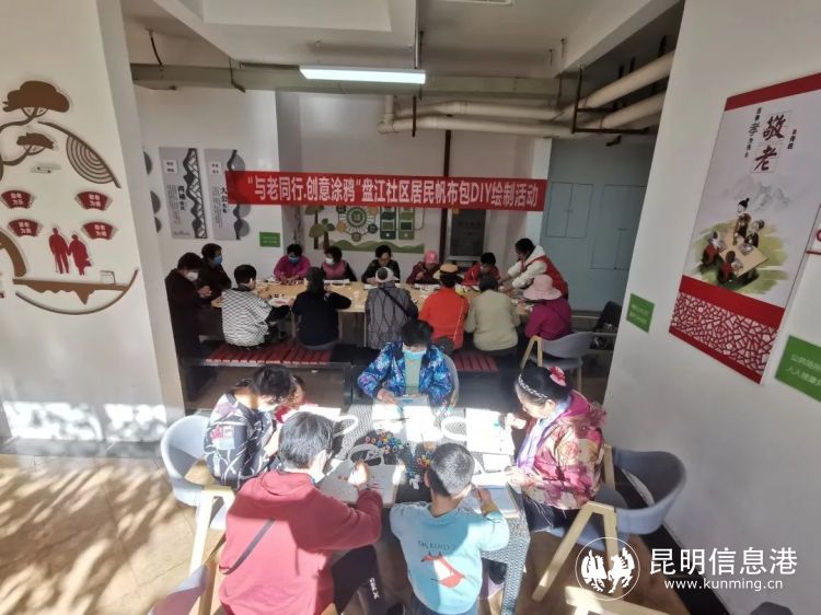 昆明信息港讯 记者劳学丽 为满足辖区居民多样化学习需求,丰富辖区居民业余生活,传承传统手工文化,践行绿色可持续发展观,向辖区居民倡导绿色环保的生活理念,龙泉街道盘江社区联合万科物业、呈贡区星灯青少年事务服务中心,于11月16日下午在盘江社区金域缇香苑8栋1单元架空层俱乐空间,开展了一场以“与老同行,创意涂鸦”为主题的环保帆布包DIY创意活动,共计40余名居民参与了本次活动。