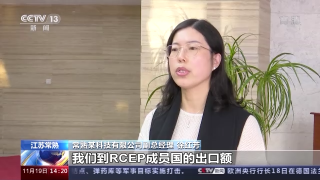 常熟某科技有限公司副总经理 徐红芳:今年前10个月我们到RCEP成员国的出口额同比增长了近四成,共申请了49份RCEP证书,合计金额706万美元,关税减免近20万美元。