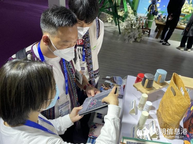 (现场工作人员介绍泸西系列文创展品—彝绣笔记本)