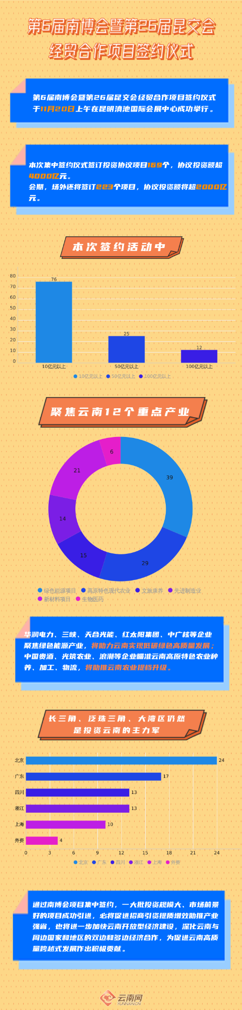 第6届南博会暨第26届昆交会经贸合作项目签约仪式于11月20日上午在昆明滇池国际会展中心成功举行。本次集中签约仪式签订投资协议项目169个,协议投资额超4000亿元。会期,场外还将签订223个项目,协议投资额将超2000亿元。