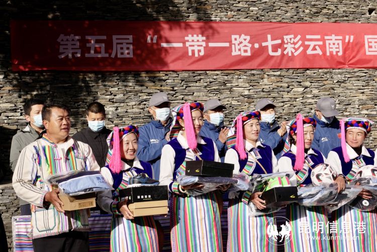19日上午,车队抵达秋那桶村开展助农捐赠活动。伴随着怒族悠扬的迎宾歌舞,在热情的欢迎仪式中,队员们走进美丽的秋那桶村。作为本次活动的捐赠代表,“一带一路·七彩云南”国际汽车拉力赛组委会、北京高德体育文化股份有限公司、中华少年儿童慈善救助基金会——青少年体育专项基金为村里的孩子们准备了足球、运动服以及足球鞋等体育用品。