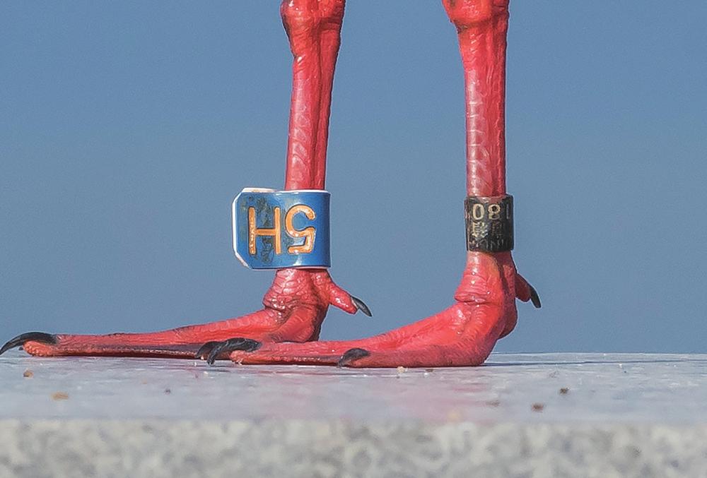 脚环有两种,其中,金属脚环由全国鸟类环志中心统一核发,带有北京1928信箱通信地址,脚环型号为G型。目前,国内开展红嘴鸥环志调查工作只在昆明地区实施,为了便于观察和识别,全国鸟类环志中心特意为来昆越冬红嘴鸥打造了一个特殊识别标记——蓝色塑料脚环,有的有字,有的无字,没有实质区别。