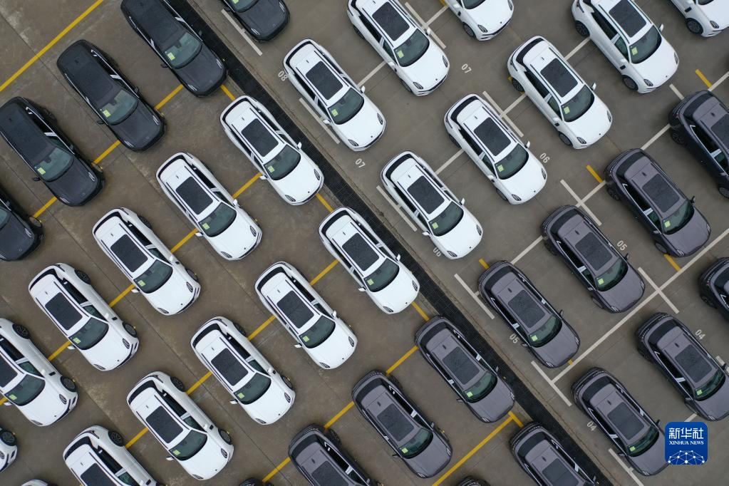 11月19日在领克汽车宁波梅山工厂拍摄的即将交付的领克09汽车(无人机照片)。