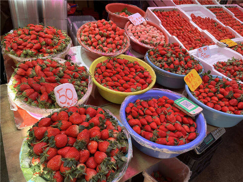 商户管先生介绍,金马正昌水果批发市场专门做草莓批发生意的有四五十家,目前每天有20—30吨草莓在市场交易。“我家一天能批出1吨左右的草莓,价格相比去年低了不少,去年品质较好的批发价25—30元/公斤,现在17—20元/公斤,而且销量不好。我们家一年四季都种植、批发草莓,主要供应奶茶店,但口感还是冬季、春季的比较好。过年后草莓的价格就会大跌,那时候量多、更便宜。”