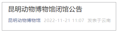 11月21日,昆明动物博物馆发布闭馆公告,2022年11月22日(周二)起昆明动物博物馆暂时闭馆,恢复开放时间另行通知。