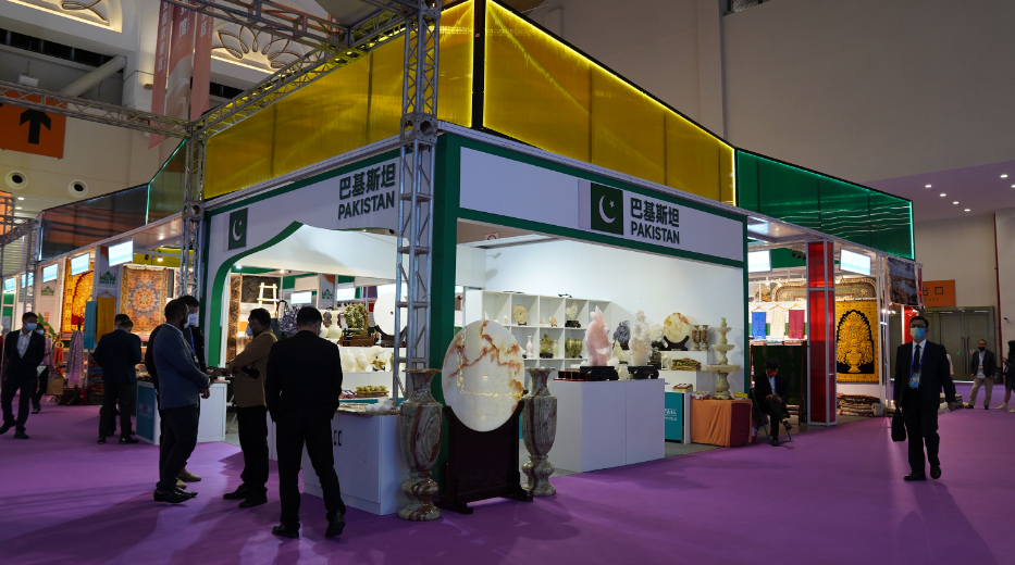 阿富汗手工羊毛地毯、克什米尔羊绒围巾、加纳的非洲鼓、巴基斯坦的花梨木工艺品……境外馆内充满了异域风情,外国参展商们热情地向顾客推介他们的商品。