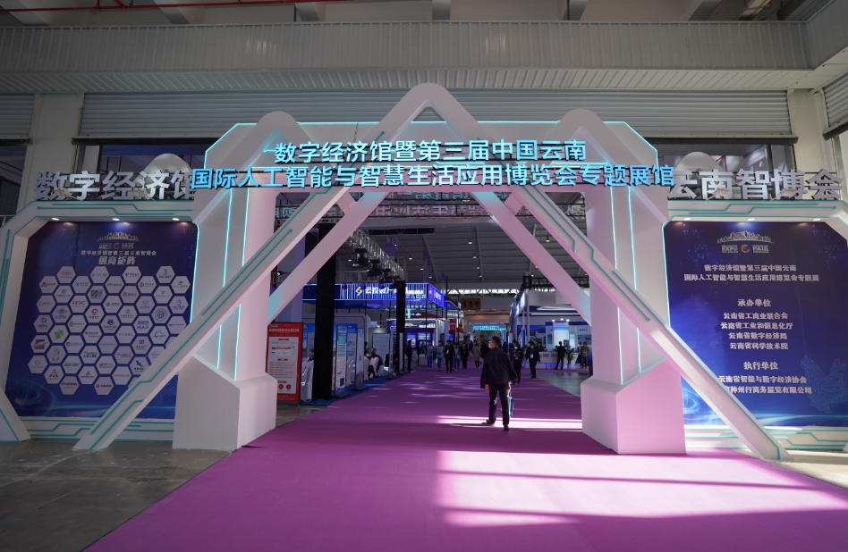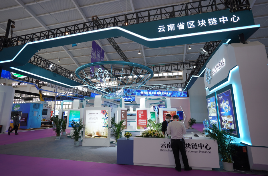 在数字经济馆内,有云南省区块链中心、京东云、云南省科学技术院等展台,科技感十足。云南省交通投资建设集团有限公司还把便捷、高效的高速公路道闸搬上了南博会。不仅如此,依托数字赋能,AI+VR智慧安全帽等手段,工程建造中实现了智慧建造。