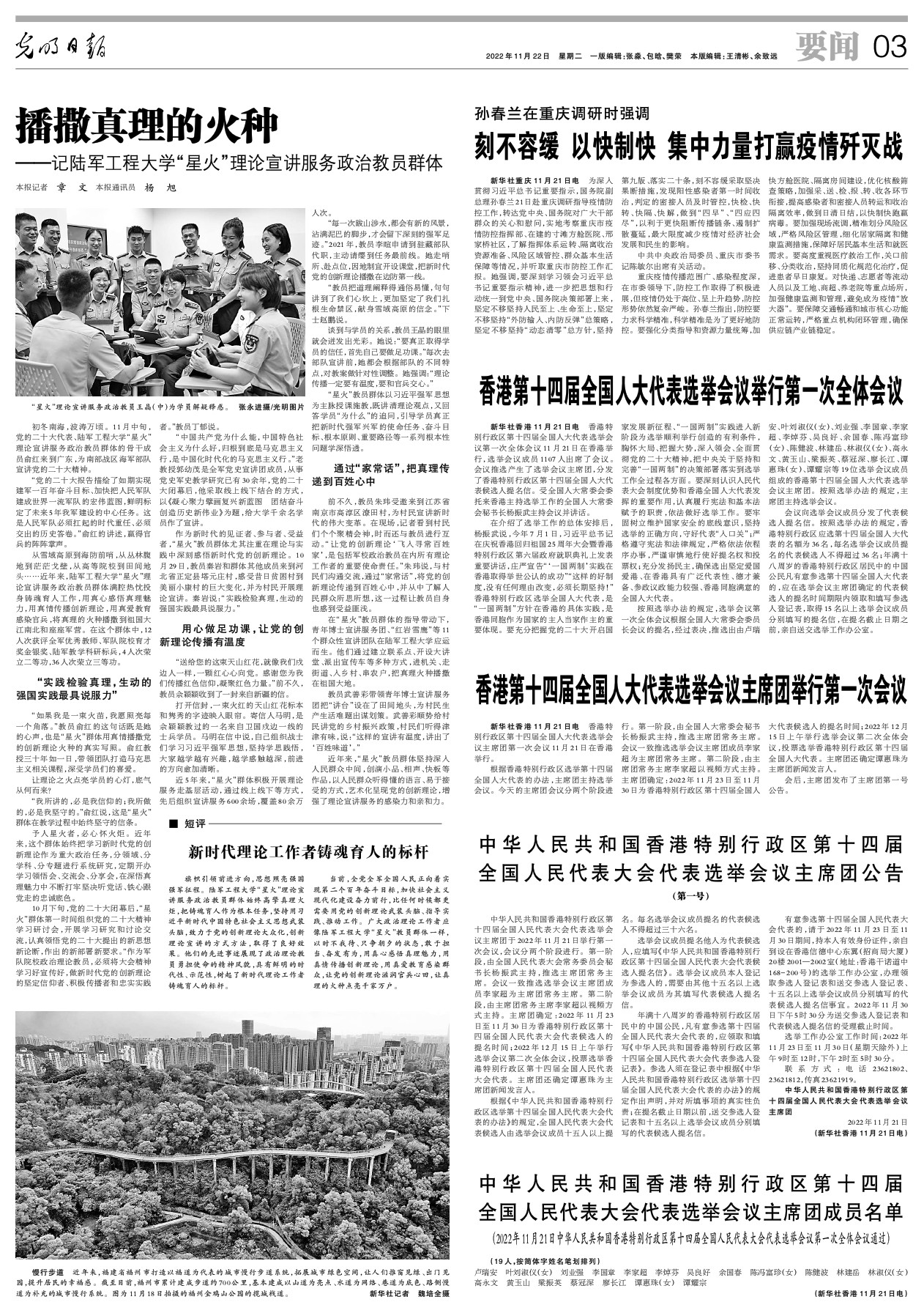 当前,全党全军全国人民正向着实现第二个百年奋斗目标,加快社会主义现代化建设奋力前行,比任何时候都更需要用党的创新理论武装头脑、指导实践、推动工作。广大政治理论工作者应像陆军工程大学“星火”教员群体一样,以时不我待、只争朝夕的状态,敢于担当、奋发有为,用真心感悟真理魅力,用真情传播创新理论,用真爱教育感染群众,让党的创新理论滋润官兵心田,让真理的火种点亮千家万户。