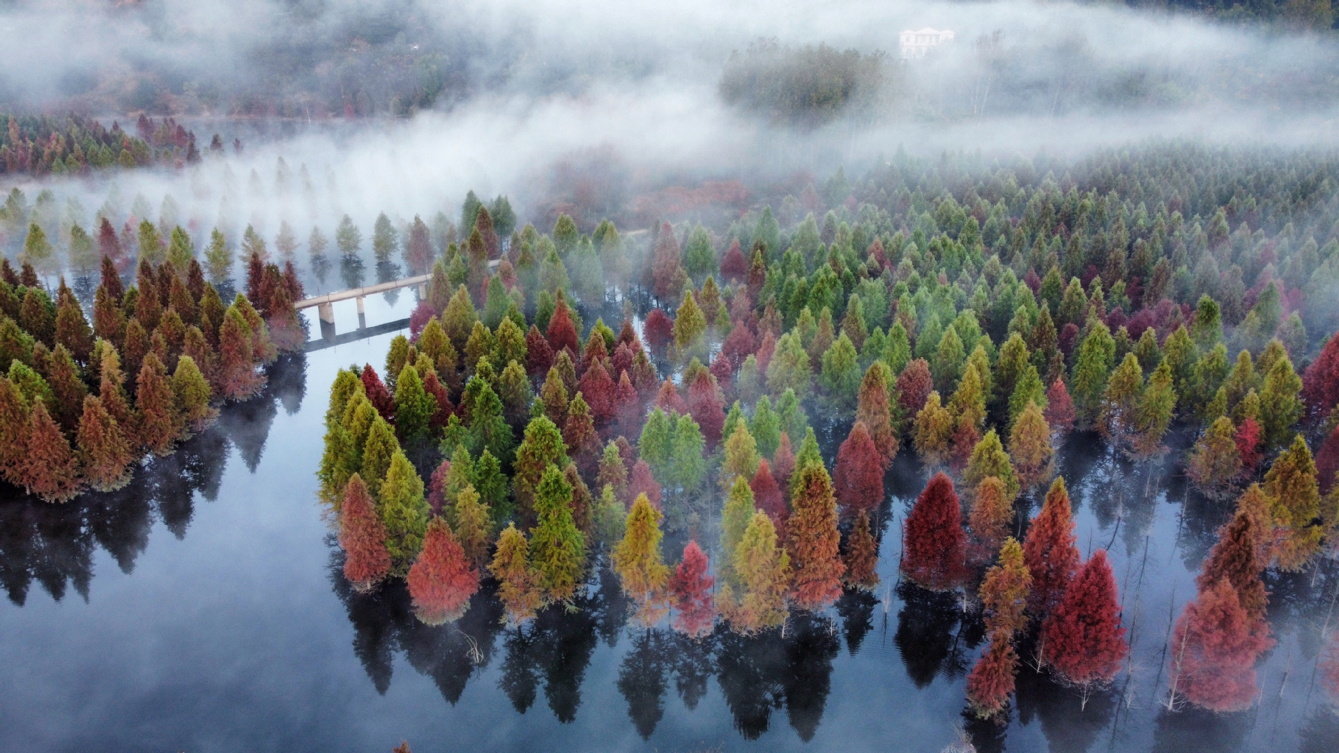 近日,云南省昆明市盘龙区滇源街道甸尾村水杉湿地的水杉林色彩艳丽,景色如画。