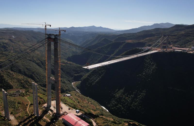 11月21日,记者来到楚雄彝族自治州永仁县宜就镇他的么村委会山头组江底河特大桥施工现场,塔吊耸立,机器轰鸣,工人们正铆足干劲,进行主桥钢箱梁吊装、永仁岸引桥钢混组合梁钢梁顶推施工。