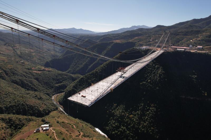作为永大高速公路控制性工程,江底河特大桥位于大姚县和永仁县交界的山岭地带,上跨江底河峡谷,大桥全长1668米,桥面距江底河峡谷谷底高达350米,是楚雄州境内最大的一座在建公路悬索桥,也是云南省第三大悬索桥。