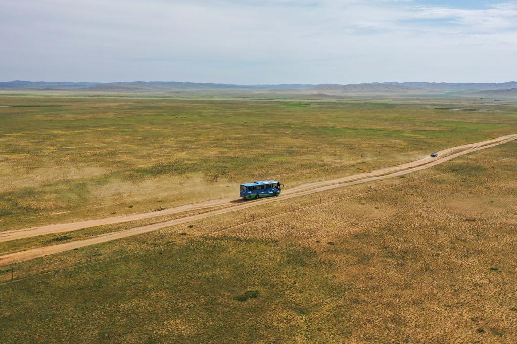 不到8点钟,院里传来发动机的轰鸣声,乌兰牧骑的大巴车出发了,迎着朝阳驶入广袤的草原中。