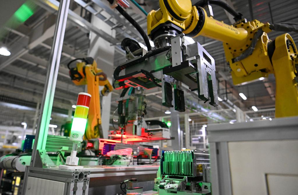 2022年7月25日,在天津荣盛盟固利新能源科技有限公司模组车间,工业机器人在生产线上搬运动力电池模组。新华社记者 孙凡越 摄