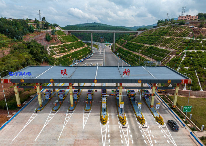 8月26日,车辆通过双柏收费站驶入玉楚高速(无人机照片)。新华社记者 江文耀 摄
