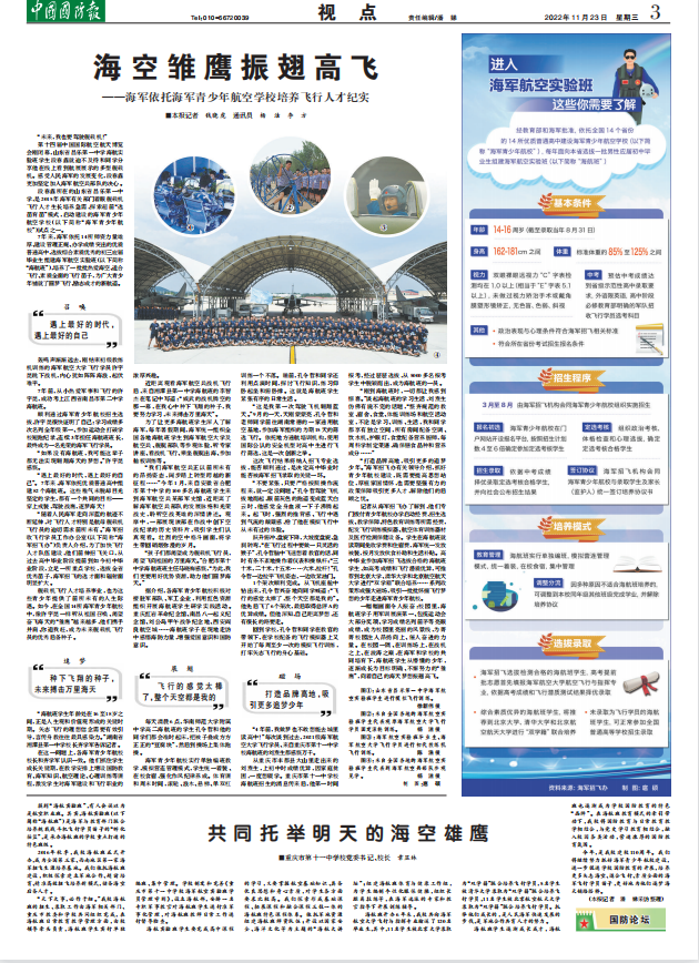 今年,是我校建校110周年。我们将继续努力抓好海军青少年航校建设,进一步促进学校国防教育的开展,培养更多矢志海空、适合飞行、素质全面的海军飞行学员苗子,更好地为他们逐梦海天铺路搭桥。(中国国防报 记者潘娣)