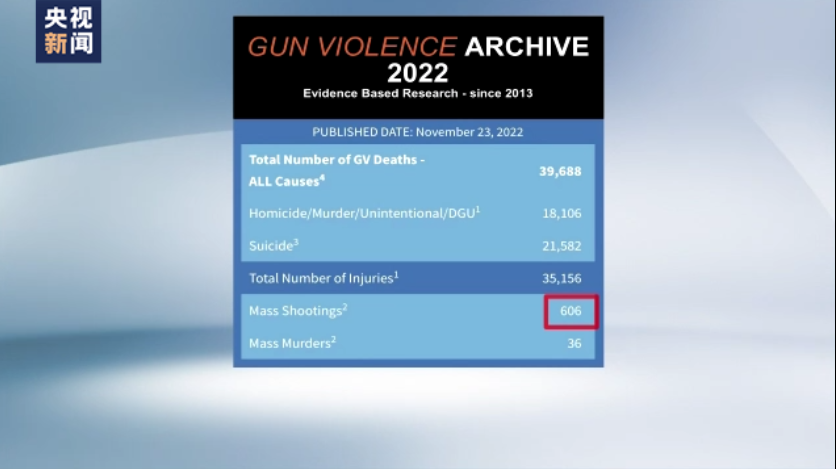 据美国“枪支暴力档案”网站的统计,截至11月23日,全美今年发生死伤达到4人及以上的大规模枪击事件已达606起,这是美国连续第3年大规模枪击案数量突破600起。