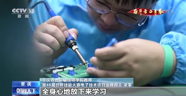 重庆铁路运输技师学院教师 第45届世界技能大赛电子技术项目金牌得主 梁攀:来到学校就是想要学好一门技能 ,(我)每天会排得满满的,全身心地放下来学习。我觉得这样每天一点点一点点地积累起来就是很大的一个改变。