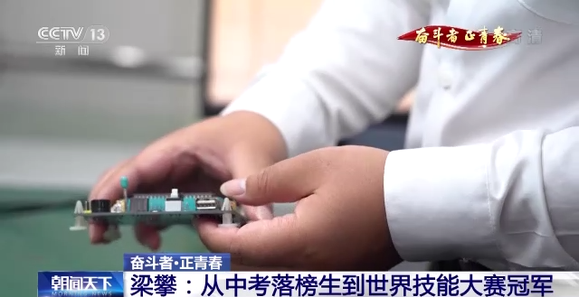 重庆铁路运输技师学院教师 第45届世界技能大赛电子技术项目金牌得主 梁攀:中考毕业后选择出去闯荡,农村工地去搬砖打杂,去餐厅做服务员。我觉得那不是我想要的生活,最后在电子厂,很多技术技能人才他们做的工作,就和我们是完全不一样的。那时候对我的激励很大,我也想像他们一样有一个技能,所以说我坚定地决定要重回学校。