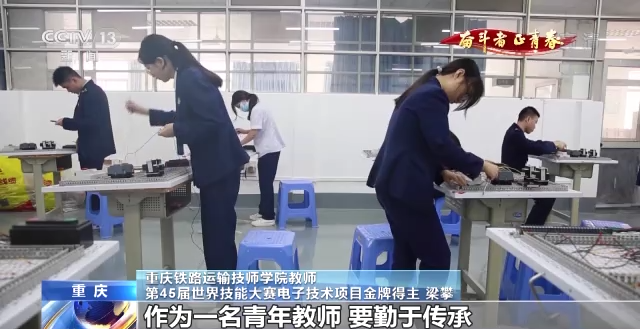在重庆铁路运输技师学院,这位正在指导学生实训的,就是青年教师梁攀,他还有另一个身份,世界技能大赛冠军。2019年,年仅22岁的他战胜强劲对手,实现了中国在这个项目上奖牌零的突破。然而很难想象的是,这位世赛冠军曾是一名中考失利放弃学业的少年。