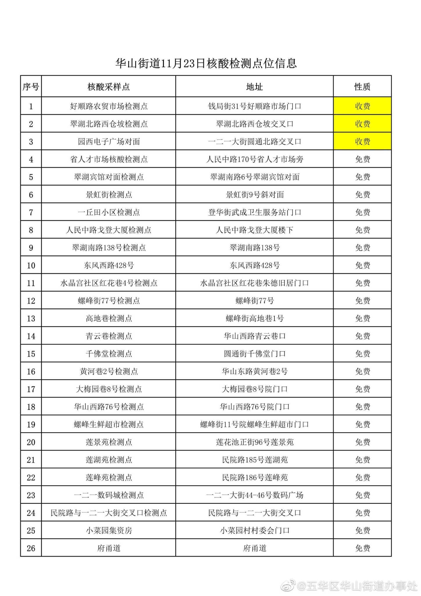 为方便辖区居民就近就便进行核酸检测,进一步优化核酸检测点设置,2022年11月23日华山街道辖区核酸检测采样点位调整如下,请居民群众自行前往进行检测。