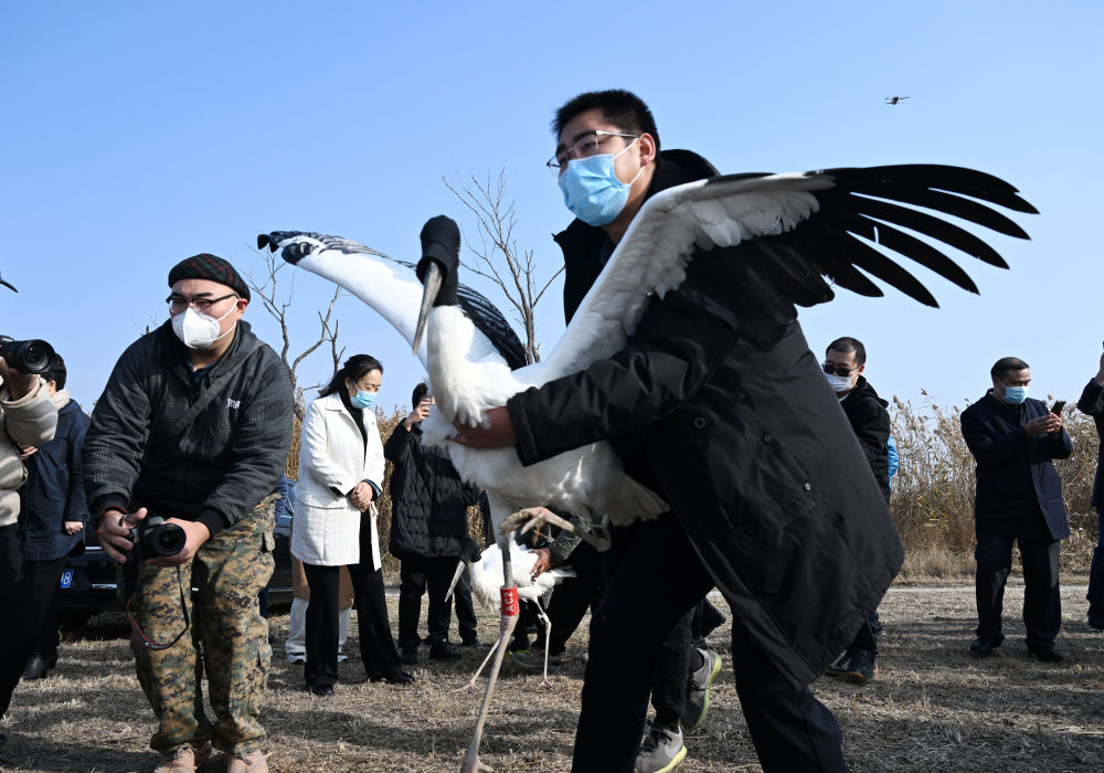 ↑11月23日,工作人员准备放飞一只东方白鹳。