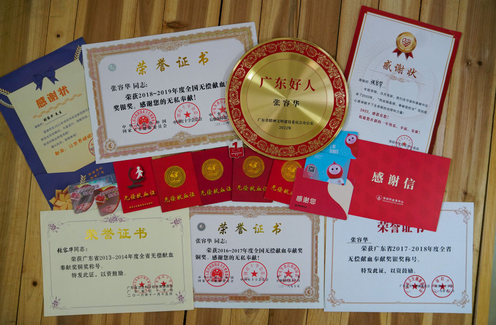 一本又一本的献血证,一条接一条的献血记录,串联起了张容华无偿献血的爱心轨迹。这些都是张容华的宝物,是他简单朴素宿舍里的唯一装饰。2022年,张容华因多年来持续献血助人为乐,被评为“广东好人”。