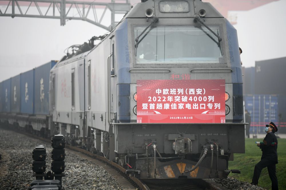 当日,满载家电产品的X8151次中欧班列从西安国际港站驶出开往欧洲。这是中国铁路西安局集团有限公司开行的首趟中欧班列家电出口专列,同时也标志着陕西中欧班列2022年开行突破4000列。此次中欧班列家电出口专列的开行,为助力国内企业拓展海外市场,推动“中国智造”走向欧洲,促进“一带一路”沿线国家贸易互通起到积极作用。(新华社记者 李一博 摄影报道)