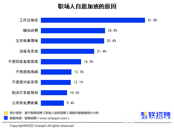 智联招聘与北京大学国家发展研究院近日联合发布《2022雇佣关系趋势报告——数字时代的多元雇佣关系》,对加班文化进行了详细分析。其中指出,24.5%职场人“自愿”加班,而白天工作没做完是主要原因;项目紧急登顶“被迫加班”原因榜首;半数职场人经历假期远程加班,并感觉最无奈。而在加班后,51.3%的人选择补觉“回血”。