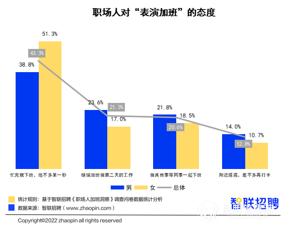 “放假却必须远程工作”“居家办公喜提隐形加班”,排在“无奈加班场景”的第一、第二位,占比分别为52.6%和40.9%。位列第三的是“生日等特殊日子还得在加班中度过”,占比达31.6%。四成职场人绝不表演加班,其中,43.3%的职场人表示,“忙完工作就下班,绝不多呆一秒”。持这一选项的女性职场人比例为51.3%,男性职场人比例为38.8%。