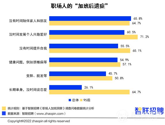 当然,有收获就有失去。65.8的受访职场人认为,加班导致“没有时间陪伴家人和朋友”;60.5%的人认为,加班导致“没时间发展个人兴趣爱好”;还有45.7的人认为,加班导致“变胖、脱发”;更有26.1%的人认为,加班导致“长期单身,没时间谈恋爱”。